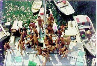 We sail to the Regatta on Friday morning on the S/V Mortail, a 47 foot trimaran and by Friday afternoon, we usually have five or six other boats rafted up with us. There is only one rule on the boat--no clothes. So if you're coming by to visit us, prepare to disrobe. After all, you DO want to join in the fun, don't you? As you can see, we usually draw quite a crowd. Two huge club speakers, an awesome sound system, and non-stop party action above (and especially below) decks keep the crowd very entertained! Over-zealous audience members may be doused with ice water from the pressurized water fire extinguishers on board, so beware--behave or be chilled! There tends to be a lot of "dancing" on deck, as you can see. We DO try to make sure everyone has a great time! Last year we had an adult film producer and film crew on board, but then that's another story... |
