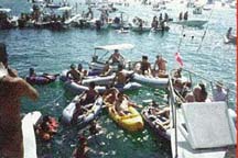 I never miss the famous Columbus Day Regatta held each Columbus Day weekend in beautiful Biscayne Bay just souith of Miami. Of course, there is a sailboat race, but I've never been close to it. The real party is in the south anchorage where boaters from all over converge for three days of loud dance music, rafts of boats, wild abandon, and--oh yes--plenty to drink for everyone. There are usually in excess of 500 boats, so it can be really a lot of fun. |